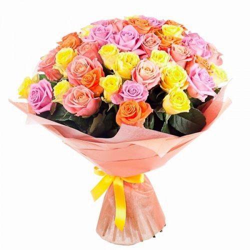 В поисках подходящего подарка для подруги в день рождения или красивого поздравления для коллеги стоит отдать предпочтение пышной композиции из 51 разноцветной зоны. Такие букеты выглядят поистине роскошно и несут в себе исключительно положительную символику. Сочные желтые бутоны олицетворяют дружескую заботу, жизнерадостность и свободу. В компании с розовыми и персиками розами они раскрывают восхищение и наилучшие пожелания. В оранжевых бутонах может скрываться признание в любви, но в компании с другими цветами они проявляют себя как символ гордости и очарования.