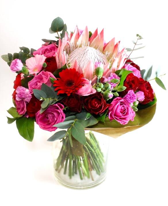 1 протея, 17 роз, 5 гермини, 5 шабо, эвкалипт, салал, упаковка, лента