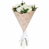 Нежные белые розы подарят весеннее настроение, сообщат любимому человеку о радости встречи и о ее долгожданности. Оригинальное декорирование из зелени дополняет цветочный ансамбль свежими нотками, подчеркивая прелесть белоснежных лепестков. Такой букет пробуждает в сердце веру в искренность, чистоту помыслов и надежность дарителя.