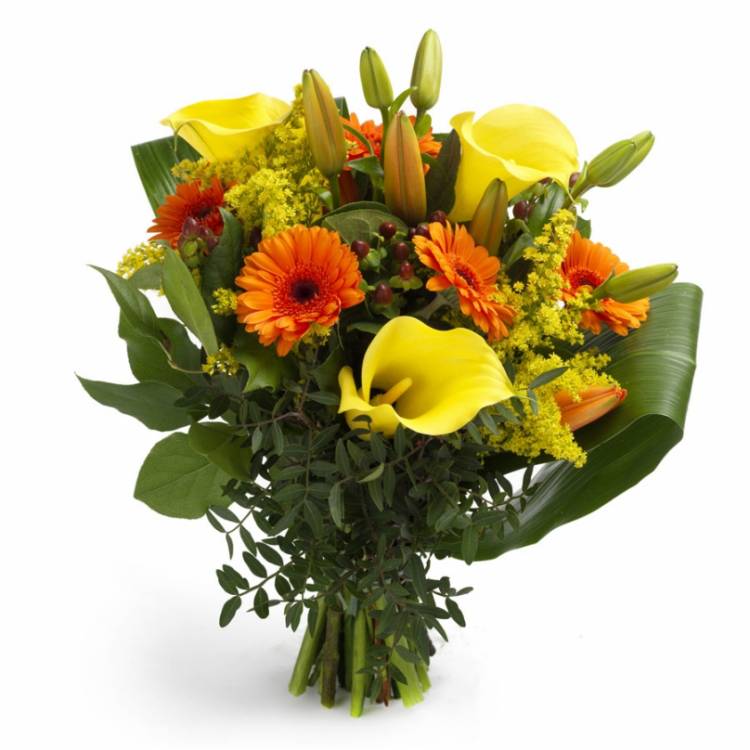 Яркая солнечная композиция никого не оставит равнодушным. Букет наверняка станет великолепным подарком дорогому коллеге. Элегантные лепестки желтых калл выразят уважение, а оранжевые герберы поднимут настроение и будут радовать глаз на протяжении длительного времени. Скромная, но одновременно выразительная композиция, станет универсальным подарком в праздничный и обыденный день.